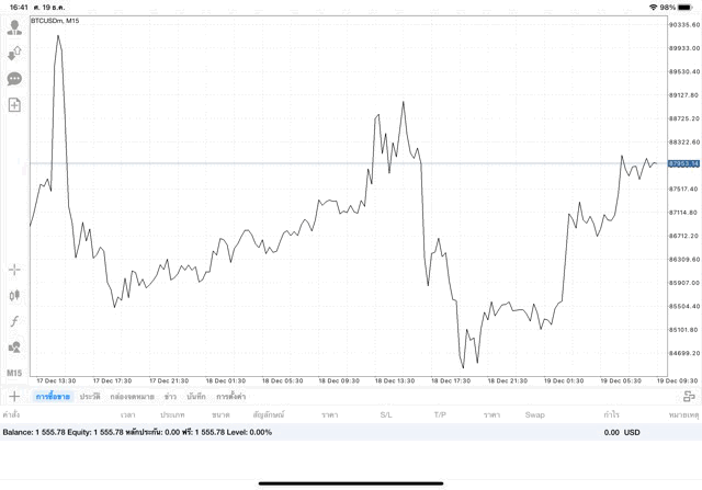 หากนักลงทุนหา BTCUSD ไม่เจอ คลิ๊กปุ่มลูกศรขึ้นลงบนแผงเมนูด้านข้าง เมื่อแผงรายชื่อหุ้นปรากฎ คลิ๊กปุ่ม + เหนือแผงรายชื่อหุ้น เลือก โฟลเดอร์ Crypto เพิ่ม BTCUSD เข้ามา เมื่อ BTCUSD มาอยู่บนแผงรายชื่อหุ้นแล้ว คลิ๊กค้างบน BTCUSD แล้ว เปิดกราฟ วิเคราะห์ราคาจากกราฟราคาบิทคอยน์ แล้วเริ่มซื้อขาย เปิดหน้าต่างส่งคำสั่งซื้อขาย คลิ๊กปุ่มเอกสาร + บนแผงเมนูด้านข้าง เมื่อหน้าต่างส่งคำสั่งซื้อขายปรากฎ