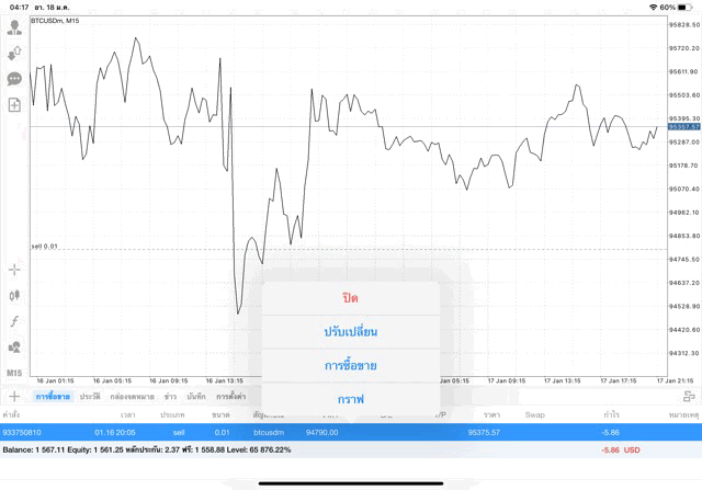 หากนักลงทุนหา BTCUSD ไม่เจอ คลิ๊กปุ่มลูกศรขึ้นลงบนแผงเมนูด้านข้าง เมื่อแผงรายชื่อหุ้นปรากฎ คลิ๊กปุ่ม + เหนือแผงรายชื่อหุ้น เลือก โฟลเดอร์ Crypto เพิ่ม BTCUSD เข้ามา เมื่อ BTCUSD มาอยู่บนแผงรายชื่อหุ้นแล้ว คลิ๊กค้างบน BTCUSD แล้ว เปิดกราฟ วิเคราะห์ราคาจากกราฟราคาบิทคอยน์ แล้วเริ่มซื้อขาย เปิดหน้าต่างส่งคำสั่งซื้อขาย คลิ๊กปุ่มเอกสาร + บนแผงเมนูด้านข้าง เมื่อหน้าต่างส่งคำสั่งซื้อขายปรากฎ