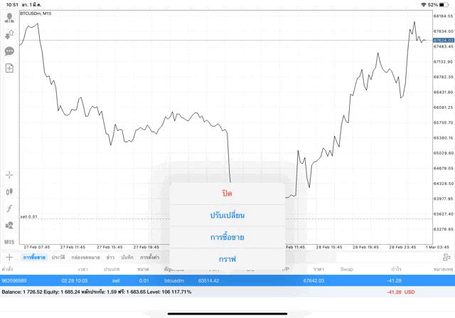 หากนักลงทุนหา BTCUSD ไม่เจอ คลิ๊กปุ่มลูกศรขึ้นลงบนแผงเมนูด้านข้าง เมื่อแผงรายชื่อหุ้นปรากฎ คลิ๊กปุ่ม + เหนือแผงรายชื่อหุ้น เลือก โฟลเดอร์ Crypto เพิ่ม BTCUSD เข้ามา เมื่อ BTCUSD มาอยู่บนแผงรายชื่อหุ้นแล้ว คลิ๊กค้างบน BTCUSD แล้ว เปิดกราฟ วิเคราะห์ราคาจากกราฟราคาบิทคอยน์ แล้วเริ่มซื้อขาย เปิดหน้าต่างส่งคำสั่งซื้อขาย คลิ๊กปุ่มเอกสาร + บนแผงเมนูด้านข้าง เมื่อหน้าต่างส่งคำสั่งซื้อขายปรากฎ