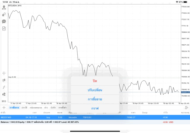 คลิ๊กค้างบน การเทรดที่เปิดไว้ การเทรดที่ต้องการปิด หากเปิดการเทรดหุ้นไว้หลายตัว เลือกคลิ๊กค้างบนการเทรดที่ต้องการปิด แล้ว เลือก ปิดสถานะ นักลงทุนสามารถเทรด Forex,ทองคำ,น้ำมัน,หุ้น,ดัชนีหุ้น,โลหะ,เงินดิจิตอล เปิดทิ้งไว้ได้หลายตัวพร้อมกัน