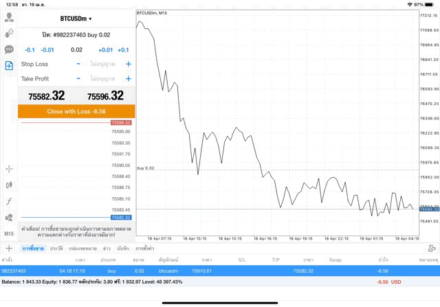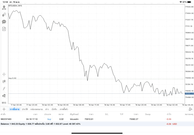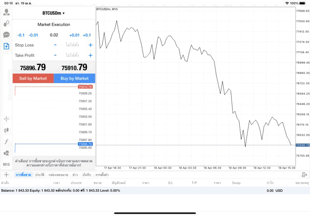 หากนักลงทุนหา BTCUSD ไม่เจอ คลิ๊กปุ่มลูกศรขึ้นลงบนแผงเมนูด้านข้าง เมื่อแผงรายชื่อหุ้นปรากฎ คลิ๊กปุ่ม + เหนือแผงรายชื่อหุ้น เลือก โฟลเดอร์ Crypto เพิ่ม BTCUSD เข้ามา เมื่อ BTCUSD มาอยู่บนแผงรายชื่อหุ้นแล้ว คลิ๊กค้างบน BTCUSD แล้ว เปิดกราฟ วิเคราะห์ราคาจากกราฟราคาบิทคอยน์ แล้วเริ่มซื้อขาย เปิดหน้าต่างส่งคำสั่งซื้อขาย คลิ๊กปุ่มเอกสาร + บนแผงเมนูด้านข้าง เมื่อหน้าต่างส่งคำสั่งซื้อขายปรากฎ