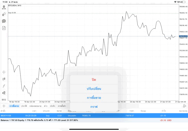คลิ๊กค้างบน การเทรดที่เปิดไว้ การเทรดที่ต้องการปิด หากเปิดการเทรดหุ้นไว้หลายตัว เลือกคลิ๊กค้างบนการเทรดที่ต้องการปิด แล้ว เลือก ปิดสถานะ นักลงทุนสามารถเทรด Forex,ทองคำ,น้ำมัน,หุ้น,ดัชนีหุ้น,โลหะ,เงินดิจิตอล เปิดทิ้งไว้ได้หลายตัวพร้อมกัน