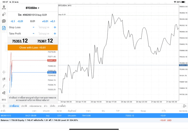 คลิ๊กปุ่มสีส้ม ปิดสถานะ หากยังไม่ปิดสถานะ ระหว่างนี้ราคายังเปลี่ยนแปลงอาจส่งผลต่อกำไรหรือขาดทุน