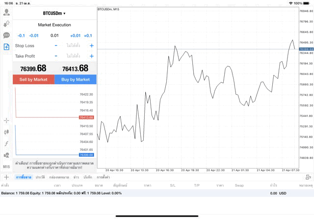 หากนักลงทุนหา BTCUSD ไม่เจอ คลิ๊กปุ่มลูกศรขึ้นลงบนแผงเมนูด้านข้าง เมื่อแผงรายชื่อหุ้นปรากฎ คลิ๊กปุ่ม + เหนือแผงรายชื่อหุ้น เลือก โฟลเดอร์ Crypto เพิ่ม BTCUSD เข้ามา เมื่อ BTCUSD มาอยู่บนแผงรายชื่อหุ้นแล้ว คลิ๊กค้างบน BTCUSD แล้ว เปิดกราฟ วิเคราะห์ราคาจากกราฟราคาบิทคอยน์ แล้วเริ่มซื้อขาย เปิดหน้าต่างส่งคำสั่งซื้อขาย คลิ๊กปุ่มเอกสาร + บนแผงเมนูด้านข้าง เมื่อหน้าต่างส่งคำสั่งซื้อขายปรากฎ