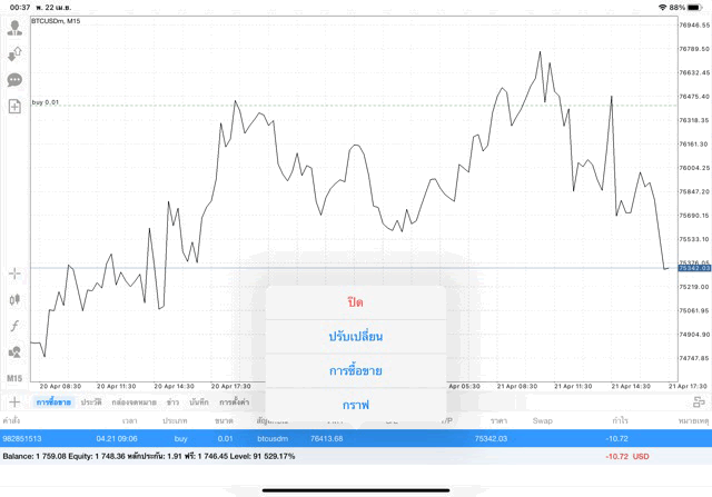 คลิ๊กค้างบน การเทรดที่เปิดไว้ การเทรดที่ต้องการปิด หากเปิดการเทรดหุ้นไว้หลายตัว เลือกคลิ๊กค้างบนการเทรดที่ต้องการปิด แล้ว เลือก ปิดสถานะ นักลงทุนสามารถเทรด Forex,ทองคำ,น้ำมัน,หุ้น,ดัชนีหุ้น,โลหะ,เงินดิจิตอล เปิดทิ้งไว้ได้หลายตัวพร้อมกัน
