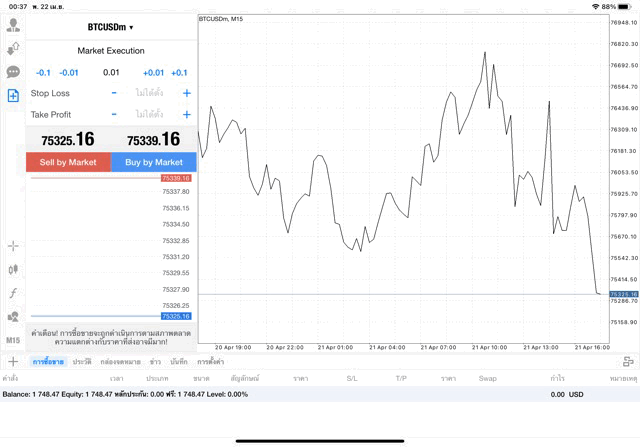 กรอกจำนวน lot ที่นักลงทุนต้องการลงทุน เช่น 0.01 lot คลิ๊กปุ่ม Buy by market หรือ Sell by market