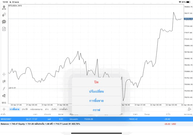 คลิ๊กค้างบน การเทรดที่เปิดไว้ การเทรดที่ต้องการปิด หากเปิดการเทรดหุ้นไว้หลายตัว เลือกคลิ๊กค้างบนการเทรดที่ต้องการปิด แล้ว เลือก ปิดสถานะ นักลงทุนสามารถเทรด Forex,ทองคำ,น้ำมัน,หุ้น,ดัชนีหุ้น,โลหะ,เงินดิจิตอล เปิดทิ้งไว้ได้หลายตัวพร้อมกัน
