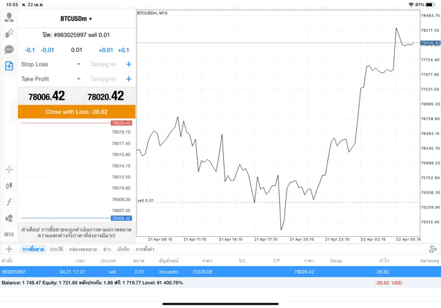 คลิ๊กปุ่มสีส้ม ปิดสถานะ หากยังไม่ปิดสถานะ ระหว่างนี้ราคายังเปลี่ยนแปลงอาจส่งผลต่อกำไรหรือขาดทุน