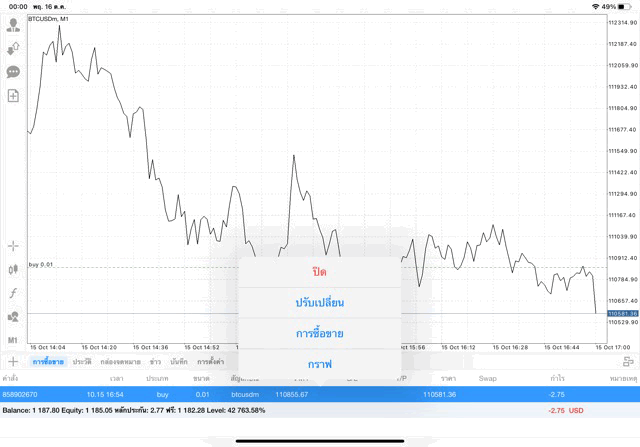 หากนักลงทุนหา BTCUSD ไม่เจอ คลิ๊กปุ่มลูกศรขึ้นลงบนแผงเมนูด้านข้าง เมื่อแผงรายชื่อหุ้นปรากฎ คลิ๊กปุ่ม + เหนือแผงรายชื่อหุ้น เลือก โฟลเดอร์ Crypto เพิ่ม BTCUSD เข้ามา เมื่อ BTCUSD มาอยู่บนแผงรายชื่อหุ้นแล้ว คลิ๊กค้างบน BTCUSD แล้ว เปิดกราฟ วิเคราะห์ราคาจากกราฟราคาบิทคอยน์ แล้วเริ่มซื้อขาย เปิดหน้าต่างส่งคำสั่งซื้อขาย คลิ๊กปุ่มเอกสาร + บนแผงเมนูด้านข้าง เมื่อหน้าต่างส่งคำสั่งซื้อขายปรากฎ
