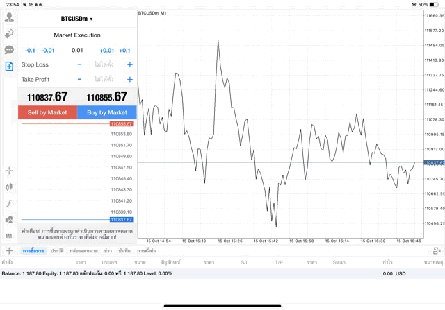 กรอกจำนวน lot ที่นักลงทุนต้องการลงทุน เช่น 0.01 lot คลิ๊กปุ่ม Buy by market หรือ Sell by market