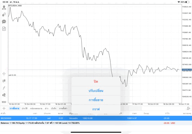 คลิ๊กค้างบน การเทรดที่เปิดไว้ การเทรดที่ต้องการปิด หากเปิดการเทรดหุ้นไว้หลายตัว เลือกคลิ๊กค้างบนการเทรดที่ต้องการปิด แล้ว เลือก ปิดสถานะ นักลงทุนสามารถเปิดเทรด Forex,ทองคำ,น้ำมัน,หุ้น,ดัชนีหุ้น,โลหะ,เงินดิจิตอล ทิ้งไว้ได้หลายตัวพร้อมกัน