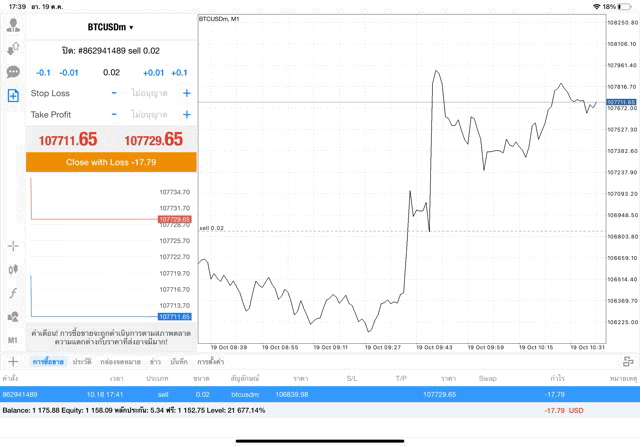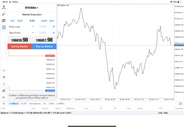 กรอกจำนวน lot ที่นักลงทุนต้องการลงทุน เช่น 0.02 lot คลิ๊กปุ่ม Buy by market หรือ Sell by market