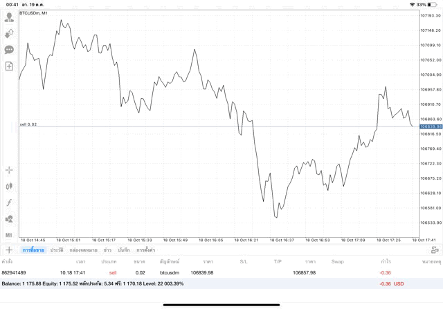 หากนักลงทุนหา BTCUSD ไม่เจอ คลิ๊กปุ่มลูกศรขึ้นลงบนแผงเมนูด้านข้าง เมื่อแผงรายชื่อหุ้นปรากฎ คลิ๊กปุ่ม + เหนือแผงรายชื่อหุ้น เลือก โฟลเดอร์ Crypto เพิ่ม BTCUSD เข้ามา เมื่อ BTCUSD มาอยู่บนแผงรายชื่อหุ้นแล้ว คลิ๊กค้างบน BTCUSD แล้ว เปิดกราฟ วิเคราะห์ราคาจากกราฟราคาบิทคอยน์ แล้วเริ่มซื้อขาย เปิดหน้าต่างส่งคำสั่งซื้อขาย คลิ๊กปุ่มเอกสาร + บนแผงเมนูด้านข้าง เมื่อหน้าต่างส่งคำสั่งซื้อขายปรากฎ