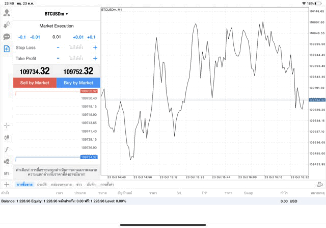 หากนักลงทุนหา BTCUSD ไม่เจอ คลิ๊กปุ่มลูกศรขึ้นลงบนแผงเมนูด้านข้าง เมื่อแผงรายชื่อหุ้นปรากฎ คลิ๊กปุ่ม + เหนือแผงรายชื่อหุ้น เลือก โฟลเดอร์ Crypto เพิ่ม BTCUSD เข้ามา เมื่อ BTCUSD มาอยู่บนแผงรายชื่อหุ้นแล้ว คลิ๊กค้างบน BTCUSD แล้ว เปิดกราฟ วิเคราะห์ราคาจากกราฟราคาบิทคอยน์ แล้วเริ่มซื้อขาย เปิดหน้าต่างส่งคำสั่งซื้อขาย คลิ๊กปุ่มเอกสาร + บนแผงเมนูด้านข้าง เมื่อหน้าต่างส่งคำสั่งซื้อขายปรากฎ
