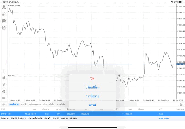 หากนักลงทุนหา BTCUSD ไม่เจอ คลิ๊กปุ่มลูกศรขึ้นลงบนแผงเมนูด้านข้าง เมื่อแผงรายชื่อหุ้นปรากฎ คลิ๊กปุ่ม + เหนือแผงรายชื่อหุ้น เลือก โฟลเดอร์ Crypto เพิ่ม BTCUSD เข้ามา เมื่อ BTCUSD มาอยู่บนแผงรายชื่อหุ้นแล้ว คลิ๊กค้างบน BTCUSD แล้ว เปิดกราฟ วิเคราะห์ราคาจากกราฟราคาบิทคอยน์ แล้วเริ่มซื้อขาย เปิดหน้าต่างส่งคำสั่งซื้อขาย คลิ๊กปุ่มเอกสาร + บนแผงเมนูด้านข้าง เมื่อหน้าต่างส่งคำสั่งซื้อขายปรากฎ