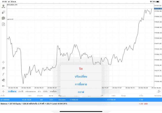 หากนักลงทุนหา BTCUSD ไม่เจอ คลิ๊กปุ่มลูกศรขึ้นลงบนแผงเมนูด้านข้าง เมื่อแผงรายชื่อหุ้นปรากฎ คลิ๊กปุ่ม + เหนือแผงรายชื่อหุ้น เลือก โฟลเดอร์ Crypto เพิ่ม BTCUSD เข้ามา เมื่อ BTCUSD มาอยู่บนแผงรายชื่อหุ้นแล้ว คลิ๊กค้างบน BTCUSD แล้ว เปิดกราฟ วิเคราะห์ราคาจากกราฟราคาบิทคอยน์ แล้วเริ่มซื้อขาย เปิดหน้าต่างส่งคำสั่งซื้อขาย คลิ๊กปุ่มเอกสาร + บนแผงเมนูด้านข้าง เมื่อหน้าต่างส่งคำสั่งซื้อขายปรากฎ