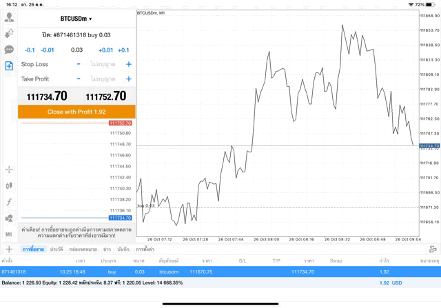 การฝากเงินเข้าไปทำการซื้อขายจริง การลงทุน lot สูงๆ นักลงทุนอาจขาดทุนเงินหมดบัญชีเทรดในช่วงพริบตา ไม่ควรลงทุนเกิน 10 % ของเงินทุน Balance การลงทุนมีความเสี่ยงสูงอาจขาดทุนเงินหมดบัญชี
