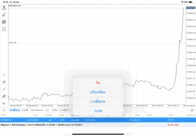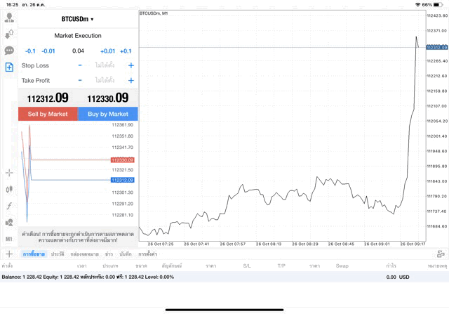 หากนักลงทุนหา BTCUSD ไม่เจอ คลิ๊กปุ่มลูกศรขึ้นลงบนแผงเมนูด้านข้าง เมื่อแผงรายชื่อหุ้นปรากฎ คลิ๊กปุ่ม + เหนือแผงรายชื่อหุ้น เลือก โฟลเดอร์ Crypto เพิ่ม BTCUSD เข้ามา เมื่อ BTCUSD มาอยู่บนแผงรายชื่อหุ้นแล้ว คลิ๊กค้างบน BTCUSD แล้ว เปิดกราฟ วิเคราะห์ราคาจากกราฟราคาบิทคอยน์ แล้วเริ่มซื้อขาย เปิดหน้าต่างส่งคำสั่งซื้อขาย คลิ๊กปุ่มเอกสาร + บนแผงเมนูด้านข้าง เมื่อหน้าต่างส่งคำสั่งซื้อขายปรากฎ