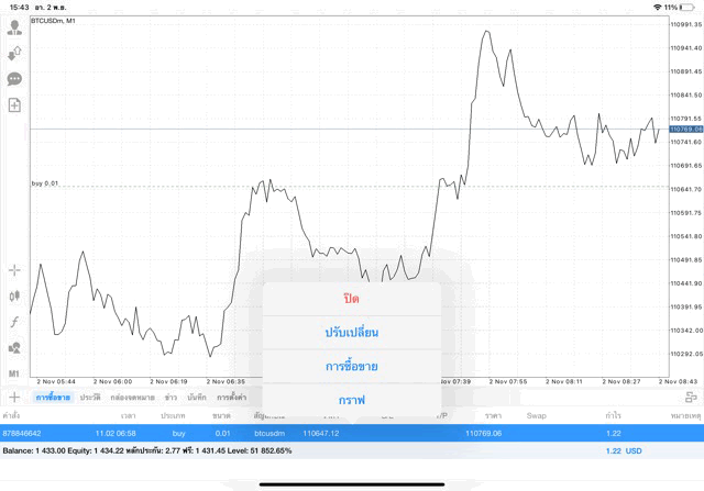 หากนักลงทุนหา BTCUSD ไม่เจอ คลิ๊กปุ่มลูกศรขึ้นลงบนแผงเมนูด้านข้าง เมื่อแผงรายชื่อหุ้นปรากฎ คลิ๊กปุ่ม + เหนือแผงรายชื่อหุ้น เลือก โฟลเดอร์ Crypto เพิ่ม BTCUSD เข้ามา เมื่อ BTCUSD มาอยู่บนแผงรายชื่อหุ้นแล้ว คลิ๊กค้างบน BTCUSD แล้ว เปิดกราฟ วิเคราะห์ราคาจากกราฟราคาบิทคอยน์ แล้วเริ่มซื้อขาย เปิดหน้าต่างส่งคำสั่งซื้อขาย คลิ๊กปุ่มเอกสาร + บนแผงเมนูด้านข้าง เมื่อหน้าต่างส่งคำสั่งซื้อขายปรากฎ