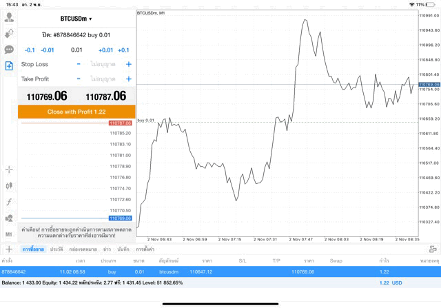การฝากเงินเข้าไปทำการซื้อขายจริง การลงทุน lot สูงๆ นักลงทุนอาจขาดทุนเงินหมดบัญชีเทรดในช่วงพริบตา ไม่ควรลงทุนเกิน 10 % ของเงินทุน Balance การลงทุนมีความเสี่ยงสูงอาจขาดทุนเงินหมดบัญชี