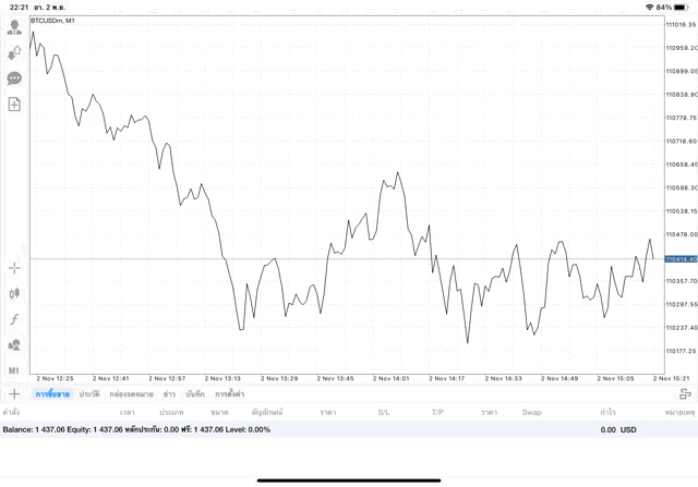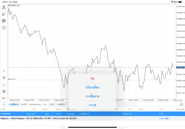 หากนักลงทุนหา BTCUSD ไม่เจอ คลิ๊กปุ่มลูกศรขึ้นลงบนแผงเมนูด้านข้าง เมื่อแผงรายชื่อหุ้นปรากฎ คลิ๊กปุ่ม + เหนือแผงรายชื่อหุ้น เลือก โฟลเดอร์ Crypto เพิ่ม BTCUSD เข้ามา เมื่อ BTCUSD มาอยู่บนแผงรายชื่อหุ้นแล้ว คลิ๊กค้างบน BTCUSD แล้ว เปิดกราฟ วิเคราะห์ราคาจากกราฟราคาบิทคอยน์ แล้วเริ่มซื้อขาย เปิดหน้าต่างส่งคำสั่งซื้อขาย คลิ๊กปุ่มเอกสาร + บนแผงเมนูด้านข้าง เมื่อหน้าต่างส่งคำสั่งซื้อขายปรากฎ