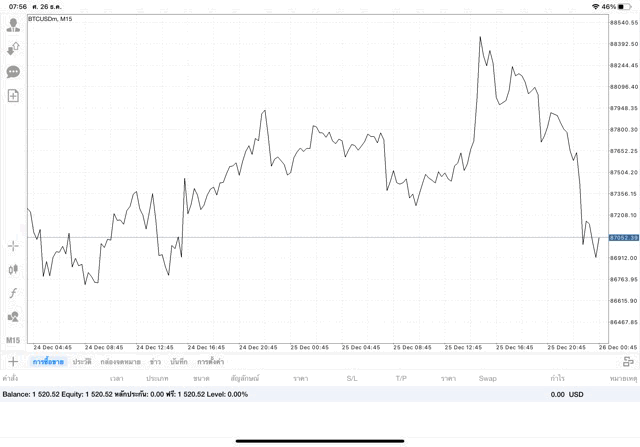 หากนักลงทุนหา BTCUSD ไม่เจอ คลิ๊กปุ่มลูกศรขึ้นลงบนแผงเมนูด้านข้าง เมื่อแผงรายชื่อหุ้นปรากฎ คลิ๊กปุ่ม + เหนือแผงรายชื่อหุ้น เลือก โฟลเดอร์ Crypto เพิ่ม BTCUSD เข้ามา เมื่อ BTCUSD มาอยู่บนแผงรายชื่อหุ้นแล้ว คลิ๊กค้างบน BTCUSD แล้ว เปิดกราฟ วิเคราะห์ราคาจากกราฟราคาบิทคอยน์ แล้วเริ่มซื้อขาย เปิดหน้าต่างส่งคำสั่งซื้อขาย คลิ๊กปุ่มเอกสาร + บนแผงเมนูด้านข้าง เมื่อหน้าต่างส่งคำสั่งซื้อขายปรากฎ