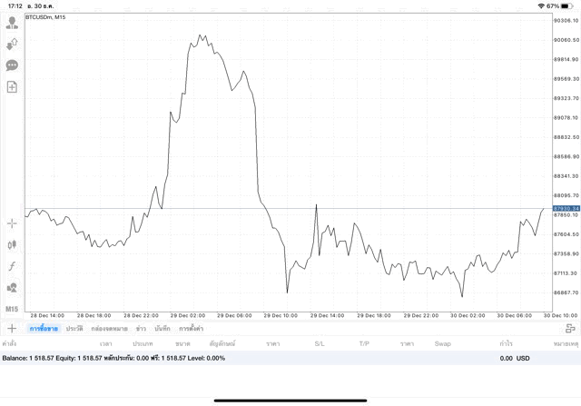 หากนักลงทุนหา BTCUSD ไม่เจอ คลิ๊กปุ่มลูกศรขึ้นลงบนแผงเมนูด้านข้าง เมื่อแผงรายชื่อหุ้นปรากฎ คลิ๊กปุ่ม + เหนือแผงรายชื่อหุ้น เลือก โฟลเดอร์ Crypto เพิ่ม BTCUSD เข้ามา เมื่อ BTCUSD มาอยู่บนแผงรายชื่อหุ้นแล้ว คลิ๊กค้างบน BTCUSD แล้ว เปิดกราฟ วิเคราะห์ราคาจากกราฟราคาบิทคอยน์ แล้วเริ่มซื้อขาย เปิดหน้าต่างส่งคำสั่งซื้อขาย คลิ๊กปุ่มเอกสาร + บนแผงเมนูด้านข้าง เมื่อหน้าต่างส่งคำสั่งซื้อขายปรากฎ